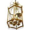 Lanterne a suspendre hexagonale style Directoire à 4 lumières Origine : France Epoque : Neuf Matériaux : Bronze Dimensions : Ht 100 x diamètre 55 cm Lanterne a suspendre hexagonale style...